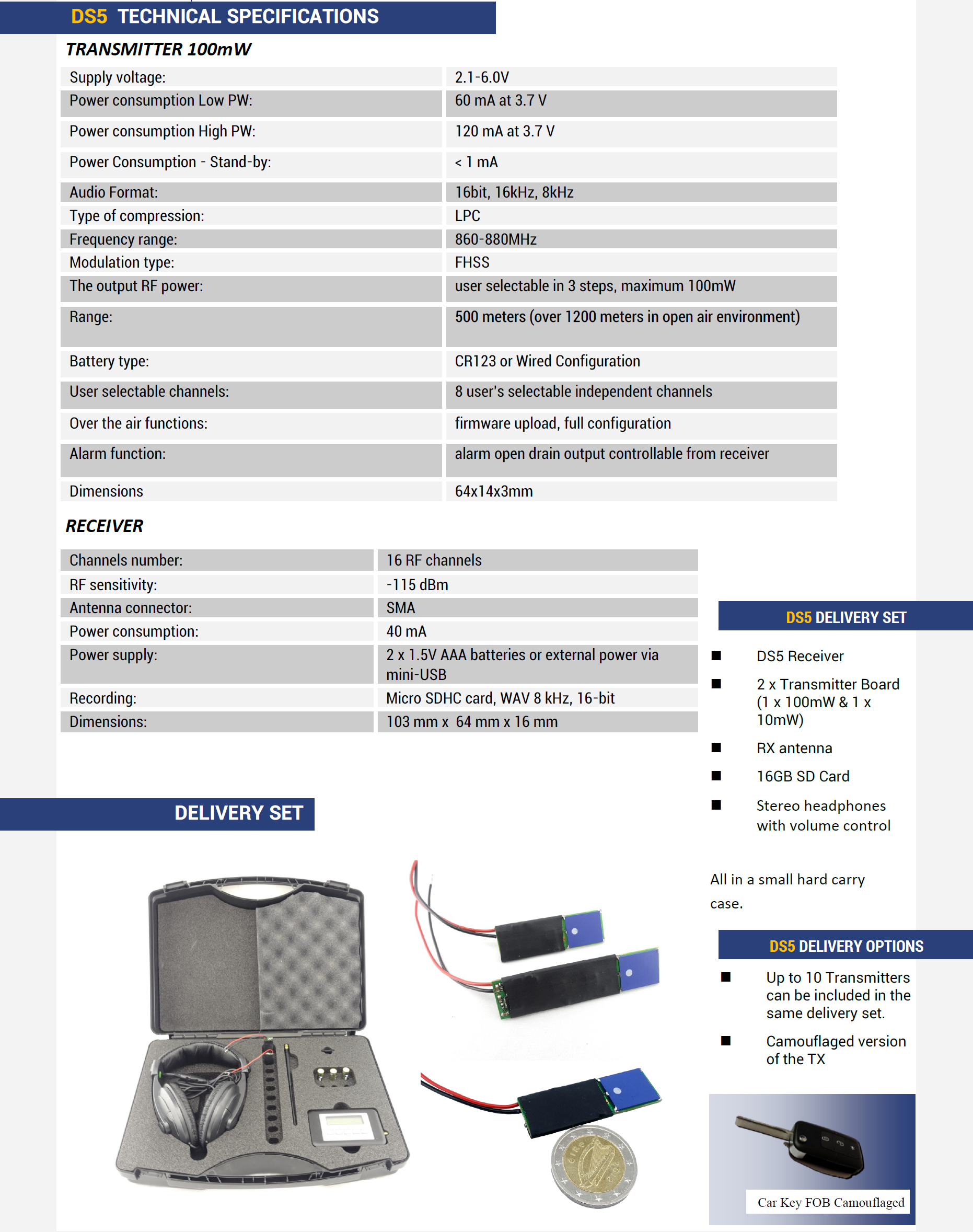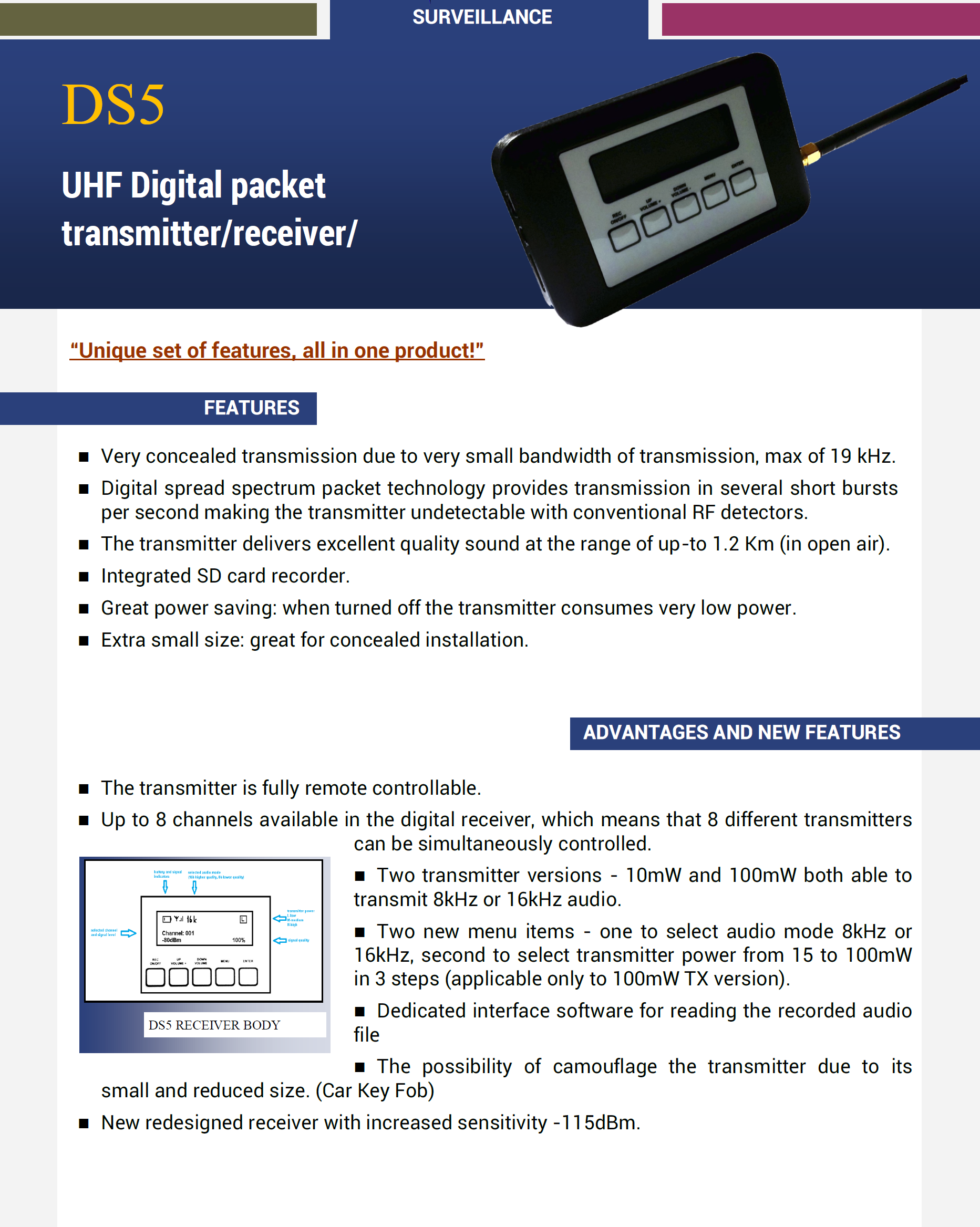 DS5 Professional UHF Digital Packet Spread Spectrum, Multiple Audio Transmitter, Receiver and Recorder System