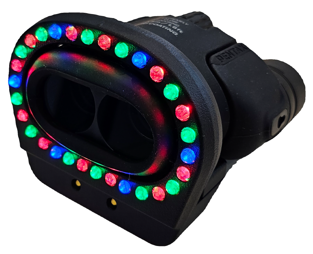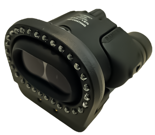The IRIS T1 all new 30 LED perimeter light array, incorporates 12 red, 12 green, and 6 blue LED lights. The LED light array is positioned so it does not extend beyond the binocular lenses and therefore does not negatively impact the field of view, keeping the binocular lenses open and unobstructed. The LED light array design also keeps the overall unit as compact, lightweight, and efficient as possible, weighing a total of 407 grams.